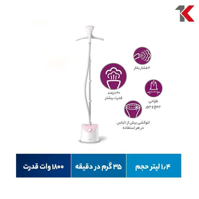 این دستگاه بخاردهی مداوم ۳۵ گرم در دقیقه دارد و همین موضوع باعث میشود چروکها بدون نیاز به فشار یا کشیدن زیاد روی پارچه از بین بروند. بخار عمودی دستگاه باعث میشود بدون تماس مستقیم سری با لباس، بتوانید انواع پارچههای ظریف، سنگین یا طرحدار را بهراحتی صاف کنید. این ویژگی مخصوصاً برای مانتو، پرده، لباس مجلسی و کت بسیار کاربردی است.
